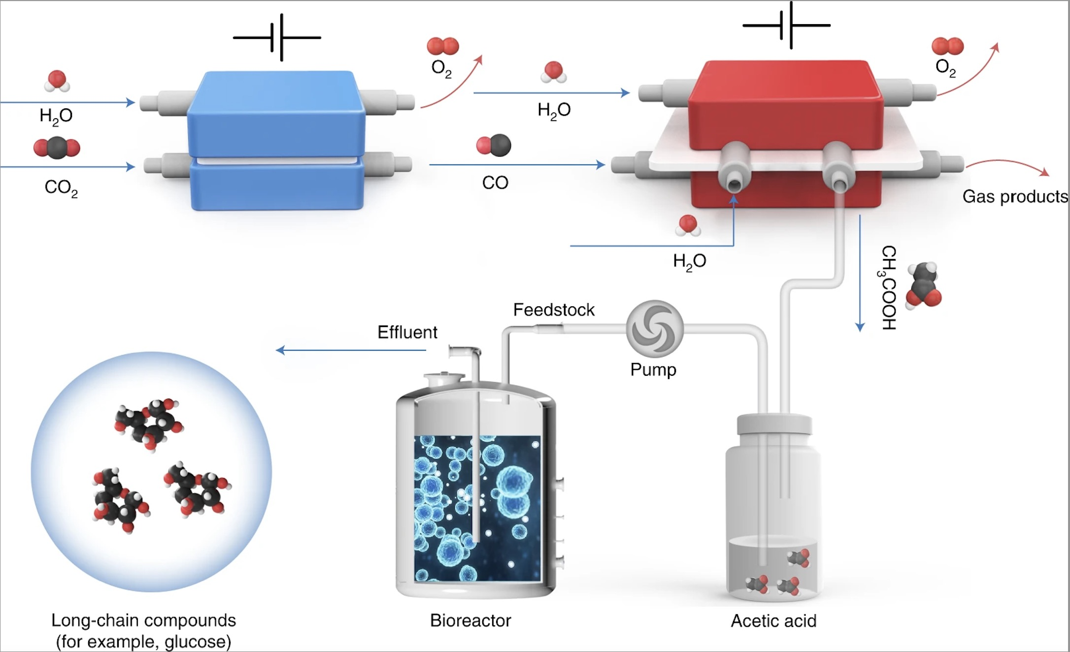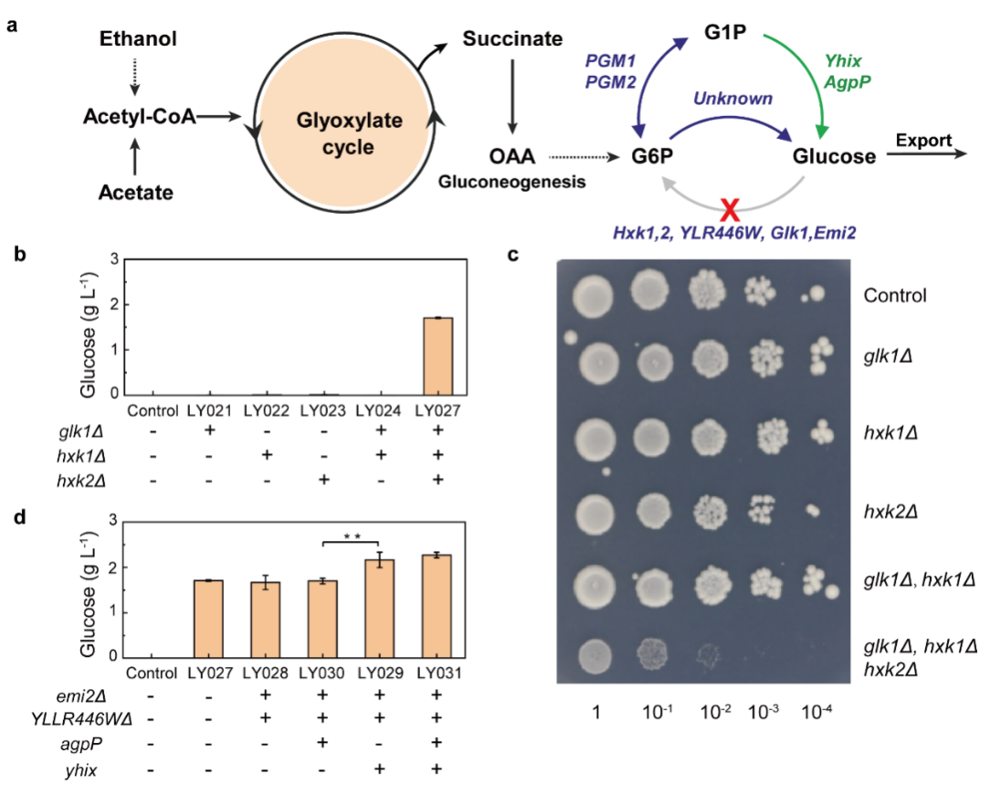 研究人员分别以电催化合成乙酸及乙酸盐为唯一碳源,分批补料添加方式,利用产糖酿酒酵母合成葡萄糖,如图4所示,酵母利用乙酸盐和乙酸为碳源合成葡萄糖产量分别为1.8 g/L, 1.5 g/L。