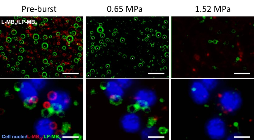 研究团队第一时间测试了L-MBα LP-MBv两种靶向微泡在水溶液混合条件下的声压爆破性能,发现红色荧光标记的L-MBα0.65MPa声压条件下可以全部爆破清除,而绿色荧光标记的LP-MBv 基本不受影响,采用1.52MPa声压则可以将LP-MBv爆破清除;接着,研究团队将两种混合靶向微泡与血管内皮细胞孵育,使它们一同结合在血管内皮细胞(蓝色)的表面,顺利获得采用0.65MPa声压可以将结合在血管内皮细胞表面的L-MBα选择性爆破,进一步提高声压至1.52MPa 则可以将残留的LP-MBv 微泡爆破,由此实现了采用梯度声压逐个爆破清除靶向微泡的方法(图1