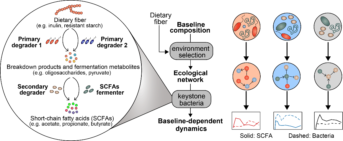 针对膳食纤维干预下肠道菌群的个性化应答现象,研究结合时序数据与数学模型,深入解析肠道菌群的生态学规律。研究揭示了微生物生态网络对于理解与预测肠道菌群应答的重要性,为开发生态层次的靶向调控手段奠定了理论基础。