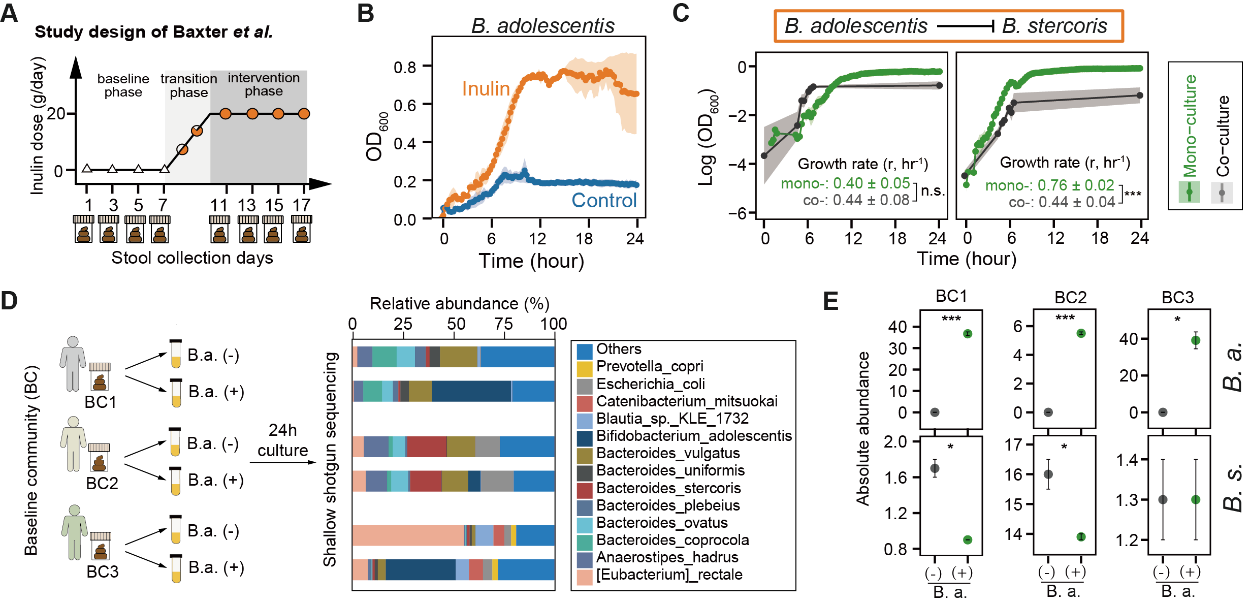 研究团队进一步将生态学模型用于分析人体肠道微生物组在膳食纤维干预下的时序数据,成功推断出具有菊粉代谢功能的青春双歧杆菌。此外,发现了青春双歧杆菌与粪便拟杆菌之间存在的竞争关系,并顺利获得体外培养实验进行了验证。比如,顺利获得向肠道菌群中补充青春双歧杆菌,可以观察到粪便拟杆菌丰度的下降(图3)。