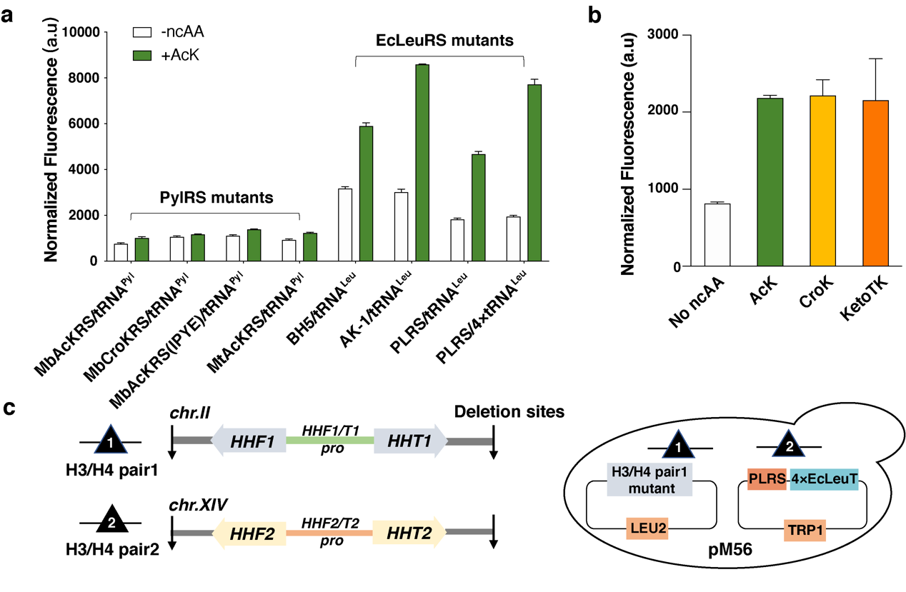 基因密码子扩展技术即顺利获得与宿主生物正交的氨酰tRNA合成酶(aminoacyl-tRNA synthetase, aaRS)/tRNA对,将非经典氨基酸(Non-canonical Amino Acid,ncAA)编码到宿主目标蛋白的特定位点上。第一时间,研究人员汇总了现有的酿酒酵母基因密码子扩展体系(包括PylRS和E.coli LeuRS 体系),将EGFP的荧光信号强度作为GCE体系编码效率的评估指标,并构建了一系列GCE体系,比较这些体系将乙酰赖氨酸(Acetyl-lysine,AcK)插入到EGFP 特定位点的效率,从中筛选出插入效率高且正交的GCE体系 --- PLRS/4xtRNALeu对(图2a)。同时研究人员发现PLRS/4xtRNALeu对巴豆酰赖氨酸(Crotonyl-lysine,CroK)以及AcK类似物KetoTK具有较好的兼容性(图2b)。