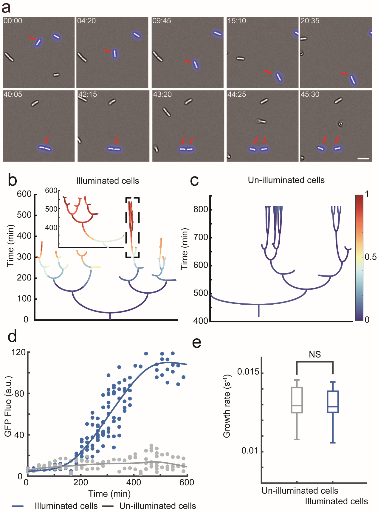 为了测试该方法潜在的应用,作者在细菌内应用了蓝光响应模块pDawn-Tn7,并在pDawn后表达绿色荧光蛋白sfGFP,从而使细菌内sfGFP荧光蛋白水平受到蓝光调控。上述基因改造的铜绿假单胞菌在流动池表面上正常运动,生长和分裂。可人为或者随机选定目标细菌,ATI将精确的持续为目标单细胞给予反馈式光遗传控制,而不影响其他的细菌。结果表明ATI在单细胞水平上很好地控制了细菌及其子代的绿色荧光蛋白sfGFP的表达(图2)。