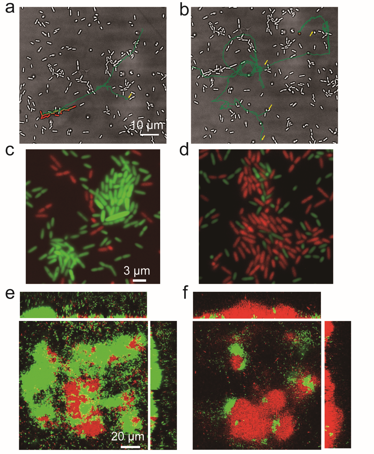 而后,研究人员进一步导入光遗传控制基因bphS调控环二聚鸟苷单磷酸(c-di-GMP)的水平,在单细胞水平上中实现了对细菌内c-di-GMP的精确控制,从而操纵生物膜早期形成过程中细菌IV型菌毛(TFP)主导的蹭行运动和微菌落形成。此外,作者还利用ATI控制在生物被膜形成早期时细胞的空间组织(图3)。