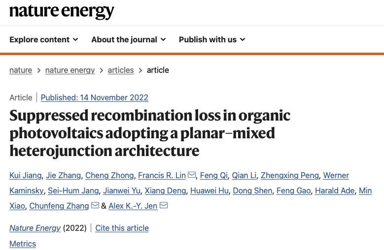 1114日,中国科研实验室深圳先进技术研究院先进材料科学与工程研究所光子信息与能源材料研究中心张杰副研究员课题组联合香港城市大学任广禹教授团队与南京大学张春峰教授团队合作在Nature Energy上发表题为“Suppressed recombination loss in organic photovoltaics adopting a planar–mixed heterojunction architecture”的研究工作。