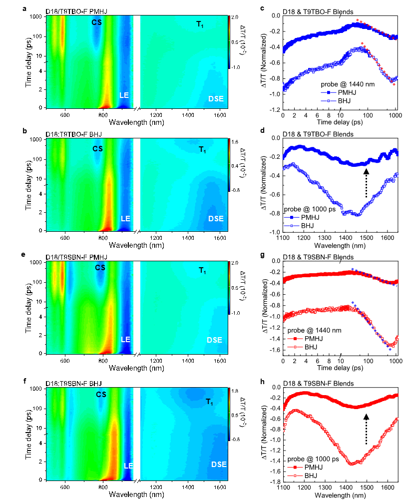研究团队顺利获得TAS测试发现在PMHJ架构中的T1信号强度明显弱于BHJ架构的同时,自由载流子的激发态吸收信号(CS)有显著增强,这显示在PMHJ架构中产生了更多的自由光生载流子。TAS测试的动力学结果显示T1产生于CS的生成之后,这表明PMHJ和BHJ器件中的T1来源于自由光生载流子在给受体界面处的双分子复合行为。因此PMHJ架构中较少的给受体接触面积可以有效地降低受体中光生电子和给体中光生空穴在给受体界面处相遇发生双分子复合的几率,即在有机光伏器件的激发态演化过程中,由CS跃迁回3CT/1CT这一载流子损失过程可以由器件工程进行有效阻断。