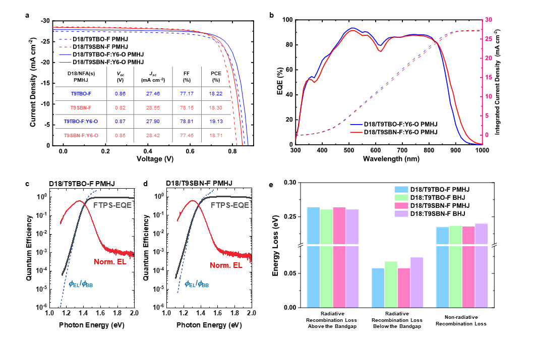 TAS实验显示出的更低光生载流子双分子复合几率和更高光生载流子数量结果相一致,采用 PMHJ架构的器件表现出比BHJ器件更高的JSC,与此同时,PMHJ和PMHJ具有几乎相同的VOC,这表明(1)PMHJ器件具有更好的电压-电流平衡;(2)在D18Y6系列给受体材料体系中并未观察到T1的形成或抑制与VOC之间的直接关联。这一工作为进一步理解T1与器件性能之间的机制,以及进一步减少电压-电流平衡限制实现更高能量转换效率给予了新的思路。