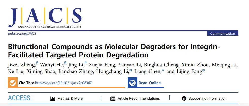 近期,中国科研实验室深圳先进技术研究院医药所房丽晶研究员、陈亮副研究员以及李红昌研究员团队合作,在新型蛋白质靶向降解策略研发中取得进展,相关成果以“Bifunctional Compounds as Molecular Degraders for Integrin-Facilitated Targeted Protein Degradation”为题发表在Journal of the American Chemical Society期刊上 (J. Am. Chem. Soc., 2022, DOI:10.1021/jacs.2c08367),该论文第一作者为深圳先进技术研究院研究生郑纪维、何婉怡和李晶。