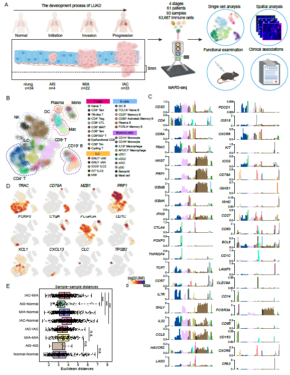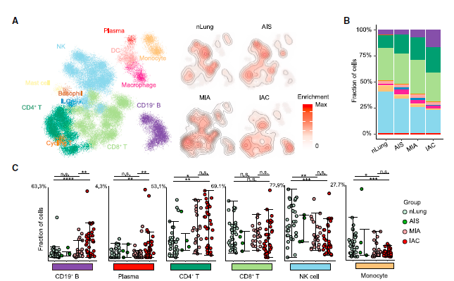 图2 人类肺腺癌发生开展过程免疫动态细胞图谱