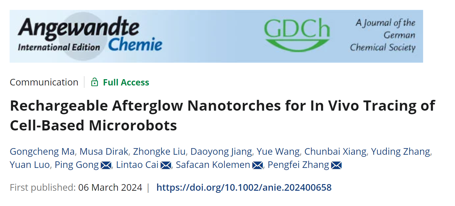 近年来,微/纳机器人的飞速开展,在生物医学领域展现出了巨大的应用潜力。但是,如何在体内长时程的对微/纳机器人进行定位与示踪面对巨大挑战。3月6日,中国科研实验室深圳先进技术研究院蔡林涛研究员团队张鹏飞副研究员、龚萍研究员等和土耳其科奇大学(Koc University) Safacan Kolemen教授合作,在国际学术期刊Angewandte Chemie International Edition发表研究论文“Rechargeable Afterglow Nanotorches for In Vivo Tracing of Cell-Based Microrobots”。