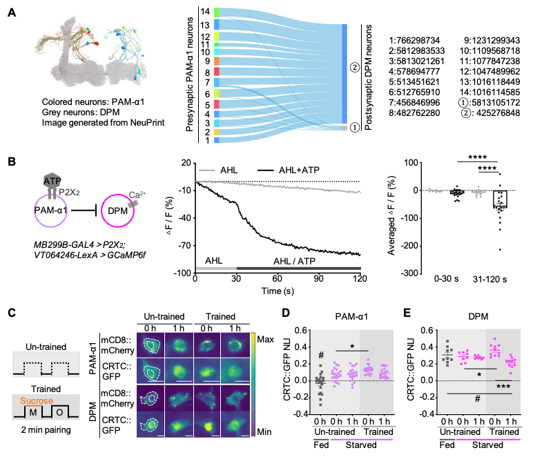 接下来,结合果蝇全脑连接组学分析、离体功能钙成像、新型的捕捉定格神经元活动的工具CRTC,研究团队发现:PAM-α1神经元与DPM神经元之间形成抑制性的突触连接,且PAM-α1-DPM微环路在记忆形成时及记忆巩固关键时间窗口呈现出协同的神经活动变化(图4)。