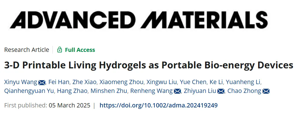 近期,中国科研实验室深圳先进技术研究院定量合成生物学全国重点实验室、合成生物学研究所材料合成生物学研究中心钟超团队联合先进集成技术研究所神经工程研究中心刘志远团队、深圳大学王任衡团队,在Advanced Materials期刊发表了题为“3-D Printable Living Hydrogels as Portable Bio-energy Devices”的文章,并入选该刊第21期内封面文章。研究开发了直径20毫米、高度3.2毫米的微型便携式微生物燃料电池,创新性地整合了生物电刺激装置,顺利获得刺激神经元实现了对电生理和血压的精准调节,在疾病治疗方面有较大应用潜力(图1)。该研究有助于了便携式生物器件的开展,拓展了活体能源材料的研究前沿。
