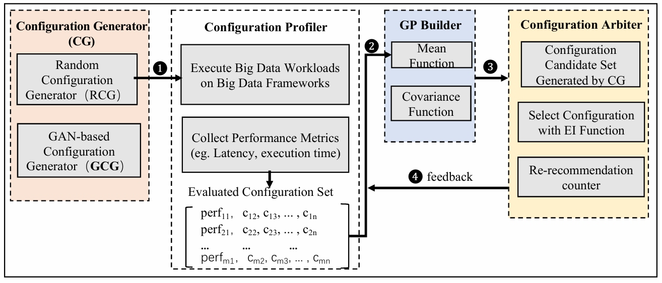 本文提出Swift方法,这是一种新颖的、基于贝叶斯优化(BO)的大数据系统参数配置快速自动调优方法。其核心思想是利用一种生成式人工智能方法,即生成对抗网络(GAN),根据已评估的性能最佳的配置来生成高质量的配置。将这些配置与随机生成的配置相混合,具有使搜索空间向最优配置倾斜的效果,从而实现更快的收敛速度,并减少优化时间。实验结果表明,与由CherryPick调优的 Flink 程序相比,Swift 将其吞吐量提升了最高达1.59倍,并将延迟最多降低了1.68倍。最重要的是,Swift仅用5.8小时就完成了优化,而CherryPick至少需要12.5小时。对于Spark程序,Swift将由CherryPick调优后的程序执行时间最多缩短了2.2倍。我们还在一家互联网巨头的生产集群中,使用Flink程序对Swift进行了评估。此前该程序是顺利获得手动调整配置参数进行优化的,一位专业的性能工程师花了四天时间才完成优化。结果显示,Swift 在仅6.8小时内就将这个经过手动优化的程序的吞吐量提升了2.3倍,并将其延迟降低了2.8倍。