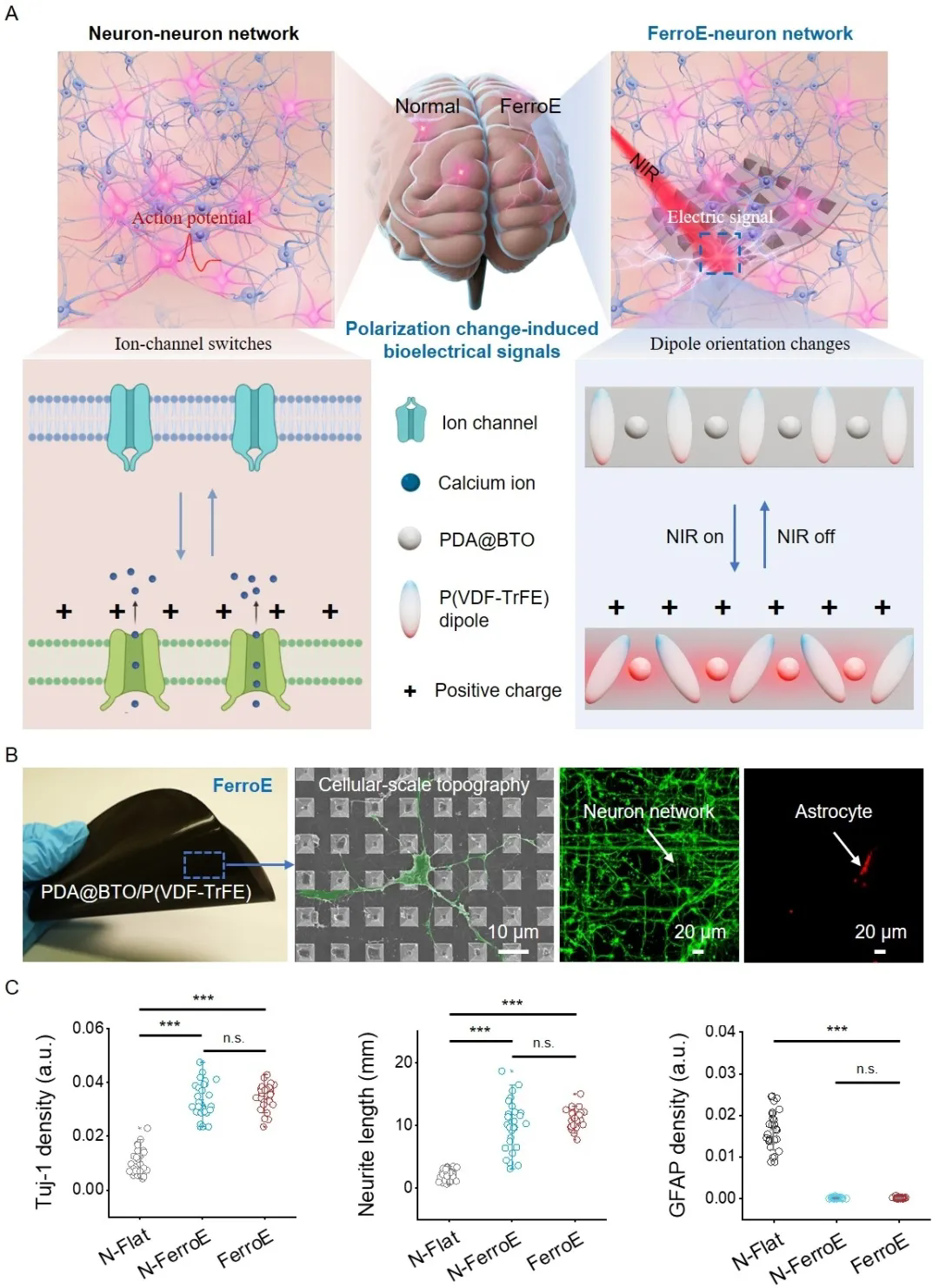 图1:类神经界面材料与铁电生物电子器件(FerroE)设计及与神经元的无缝整合