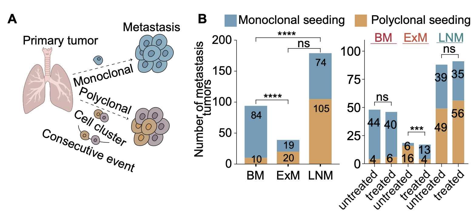 转移是导致90%以上癌症病人治疗失败和死亡的原因。其中非小细胞肺癌(NSCLC)患者中约1/3会发生脑转移。与其他转移部位不同,脑转移需跨越血脑屏障,既影响肿瘤细胞的适应性,也限制治疗方案的选择。既往关于转移的基因组学研究,主要基于非配对原发和转移的肿瘤突变图谱比较。然而,这种研究策略难以鉴定原发灶中驱动转移的突变基因,同时难以解析转移的演化规律和适应性。因此,系统分析和比较同一病人的原发灶和多器官转移灶的基因组学,阐明转移器官趋向性的基因组学特征与演化规律,具有重要意义。