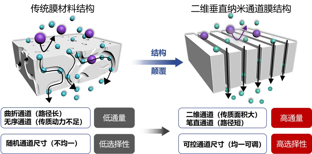 “二维垂直亚纳米通道膜”技术的颠覆性,始于对膜材料最根本“原理”、“结构”、“工艺”的重构。