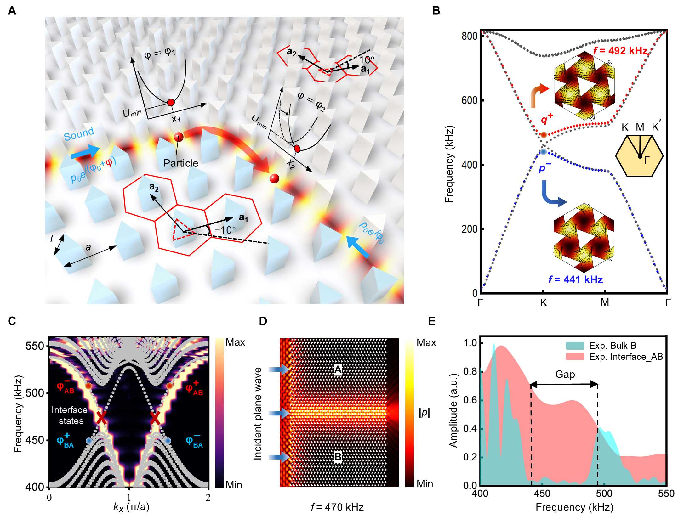 图1: 拓扑声学质量输运。(A) 利用谷霍尔拓扑绝缘体实现颗粒输运示意图。(B) 元胞能带结构。插图为两种谷态(q⁺和p⁻)的模拟本征场分布。(C) 超胞能带结构及顺利获得傅里叶变换得到的相应频谱。(D) 在470 kHz频率下,谷霍尔拓扑绝缘体中的仿真声压场分布,平面波从左边界入射。(E) 晶格B和晶格A-B界面的实验测量透射谱。在带隙范围内(如黑色虚线标注)可观察到明显的拓扑波传输。