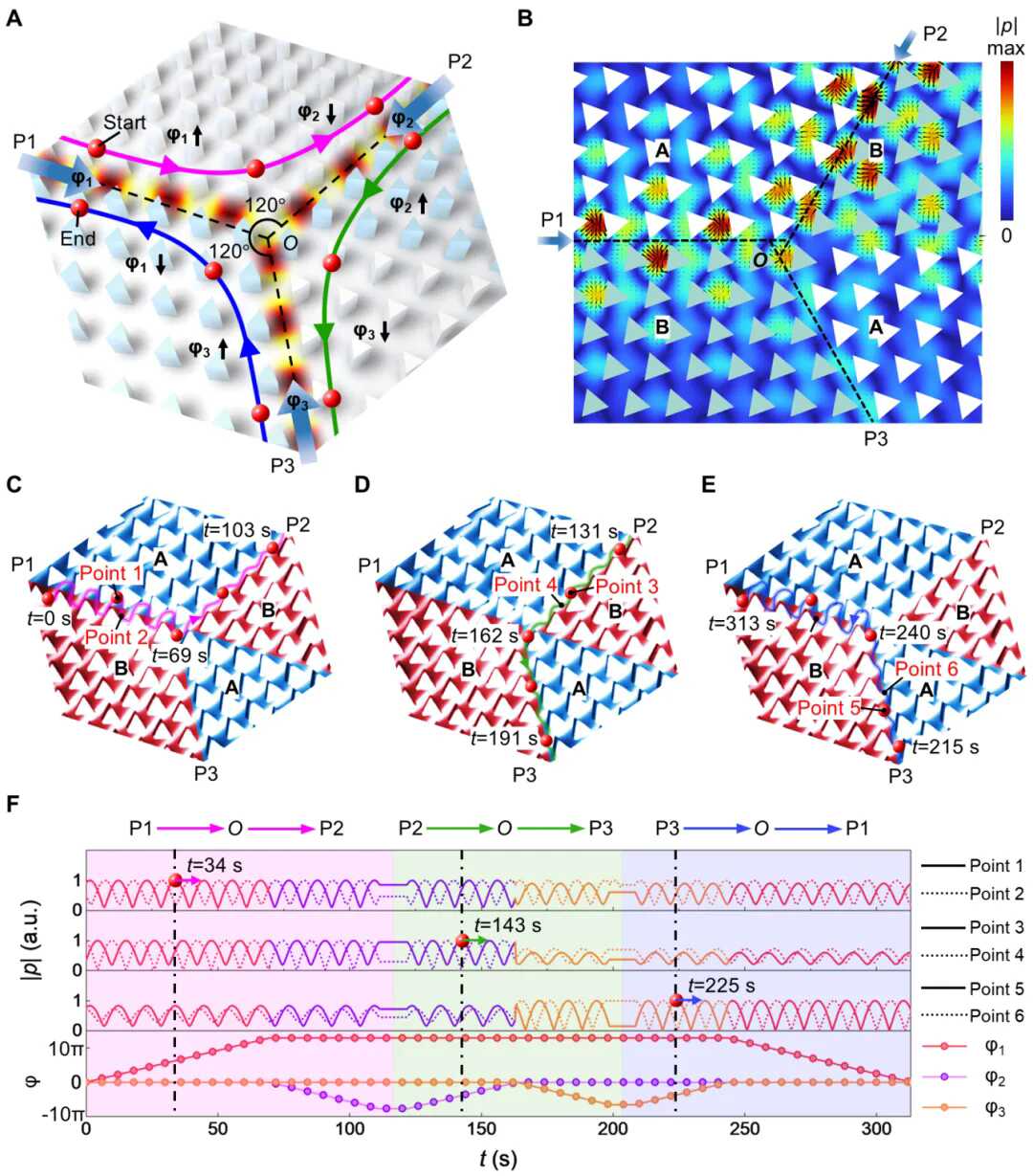 图4:拓扑质量循环。(A) 拓扑声学循环器示意图。(B) 声波从端口P1和P2入射时的仿真声压场分布。黑色箭头描绘了声辐射力的方向。(C)至(E)分别展示从端口P1到P2、从P2到P3、从P3到P1质量输运的实验结果。(F) 三个端口处声源相位的时序变化,以及在(C)至(E)中标记的六个点处计算得到的声压幅值