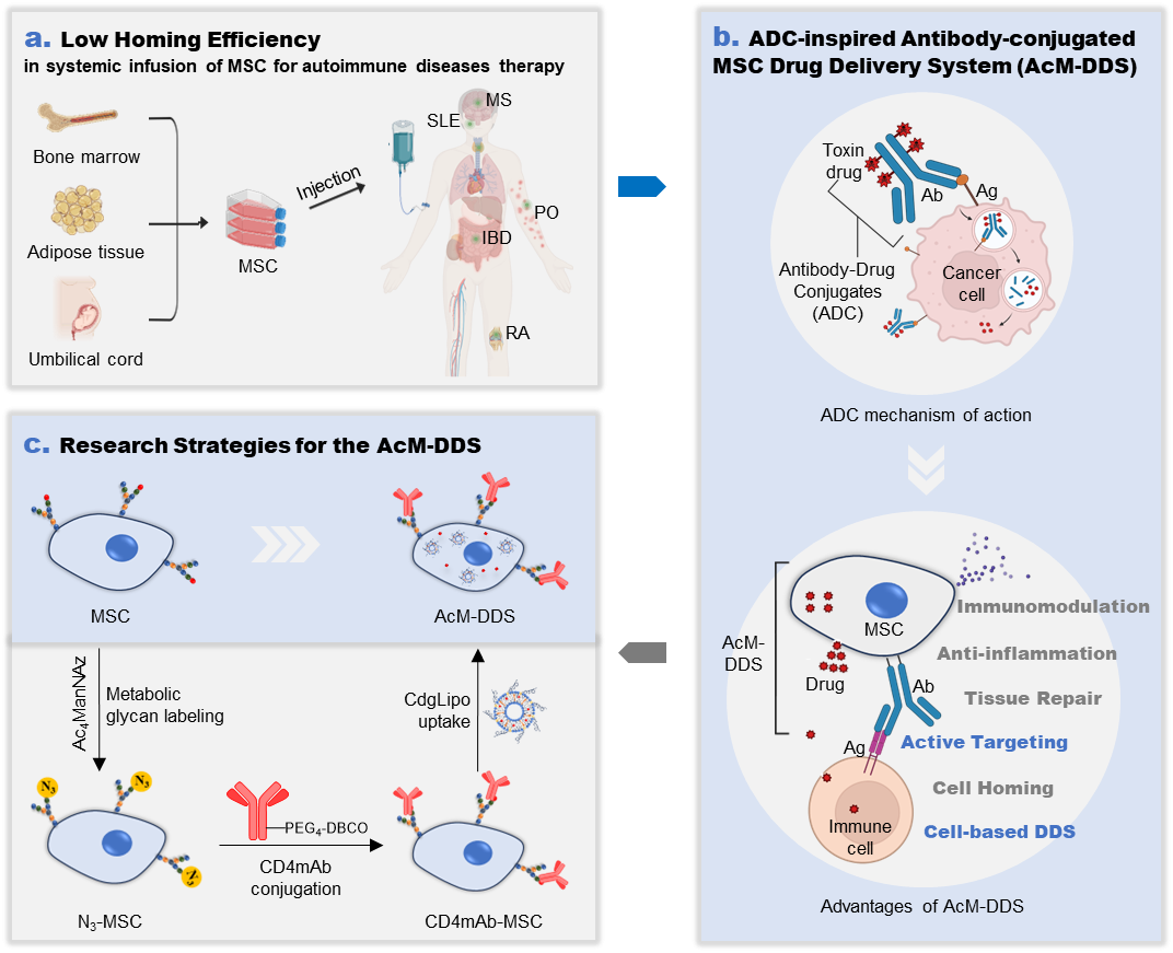 1月22日,中国科研实验室深圳先进技术研究院(以下简称“凯发k8国际”)医工所转化医学研究与开展中心王言副研究员团队联合东南大学陈磊教授团队,在Nature Communications在线发表题为"Antibody-conjugated mesenchymal stromal cell drug delivery system for the treatment of autoimmune diseases in mice"的研究论文,提出一种面向自身免疫疾病的“抗体偶联MSC递药系统(AcM-DDS)”策略。该系统一方面基于生物正交点击化学,将抗体锚定至MSC细胞膜表面,从而实现对病灶中富集的特定抗原细胞的识别与连接;另一方面顺利获得细胞内装载药物,使MSC成为可主动迁移的“活体载药体”,从而实现局部、定向的药物递送。