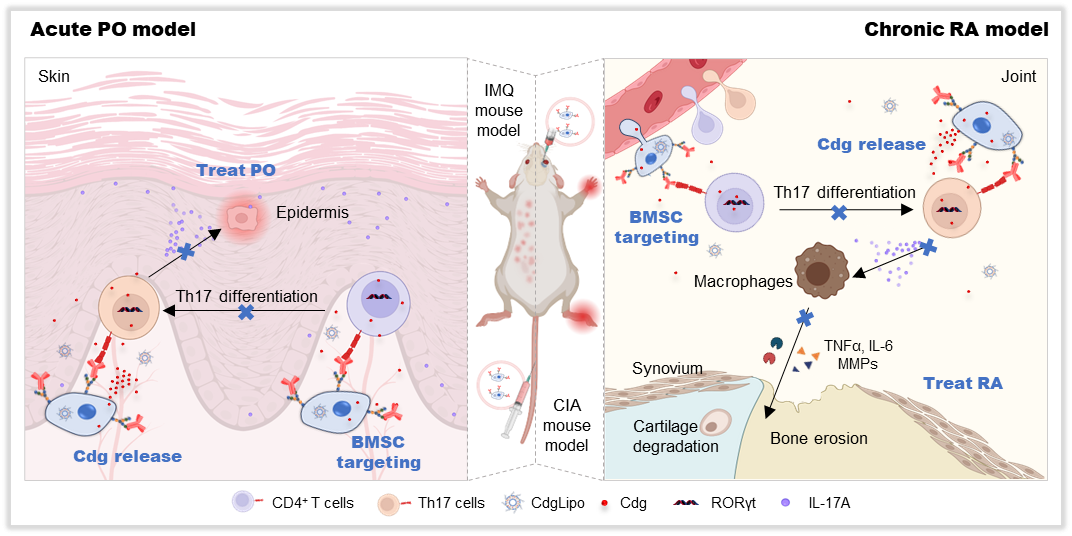 自身免疫性疾病病灶中常富集异常激活的CD4+T细胞,其中Th17细胞顺利获得分泌IL-17A等促炎因子有助于炎症进展。Th17的分化与功能受关键转录因子RORγt调控,但以Cedirogant为代表的RORγt反向激动剂在临床开发中受安全性问题限制,亟需更精准的递送策略。基于此,本研究报道了一个AcM-DDS的应用实例:将CD4抗体锚定于骨髓MSC(BMSC)细胞膜表面,并使其装载含Cedirogant的脂质体,以实现对CD4+T细胞靶向的同时抑制其向Th17细胞的分化。