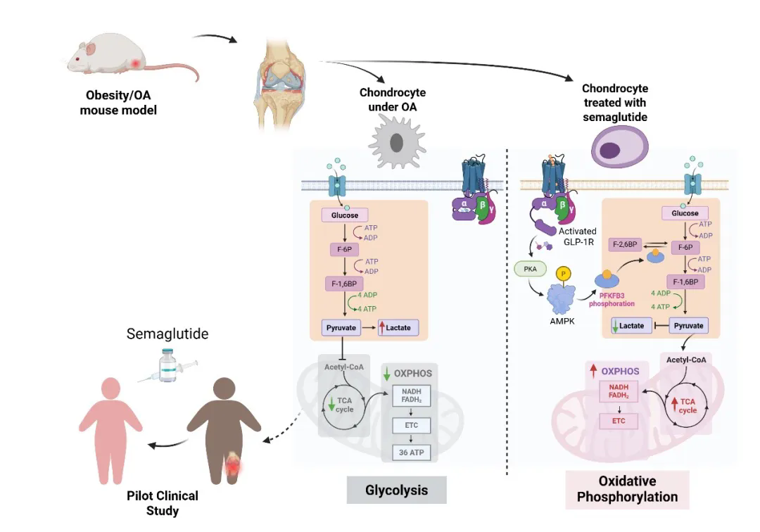 机制研究发现,司美格鲁肽能够激活一条“GLP-1R-AMPK-PFKFB3”的糖代谢信号通路,该通路能有助于骨关节炎环境下软骨细胞的能量代谢模式,从低效的糖酵解向更高效的氧化磷酸化转变,从而促进软骨修复。他们在小鼠模型上发现,敲除GLP-1R蛋白或AMPK蛋白后,司美格鲁肽对骨关节炎的保护作用和疼痛效应基本消失,证实了该信号通路是司美格鲁肽发挥骨关节炎治疗效果的关键。