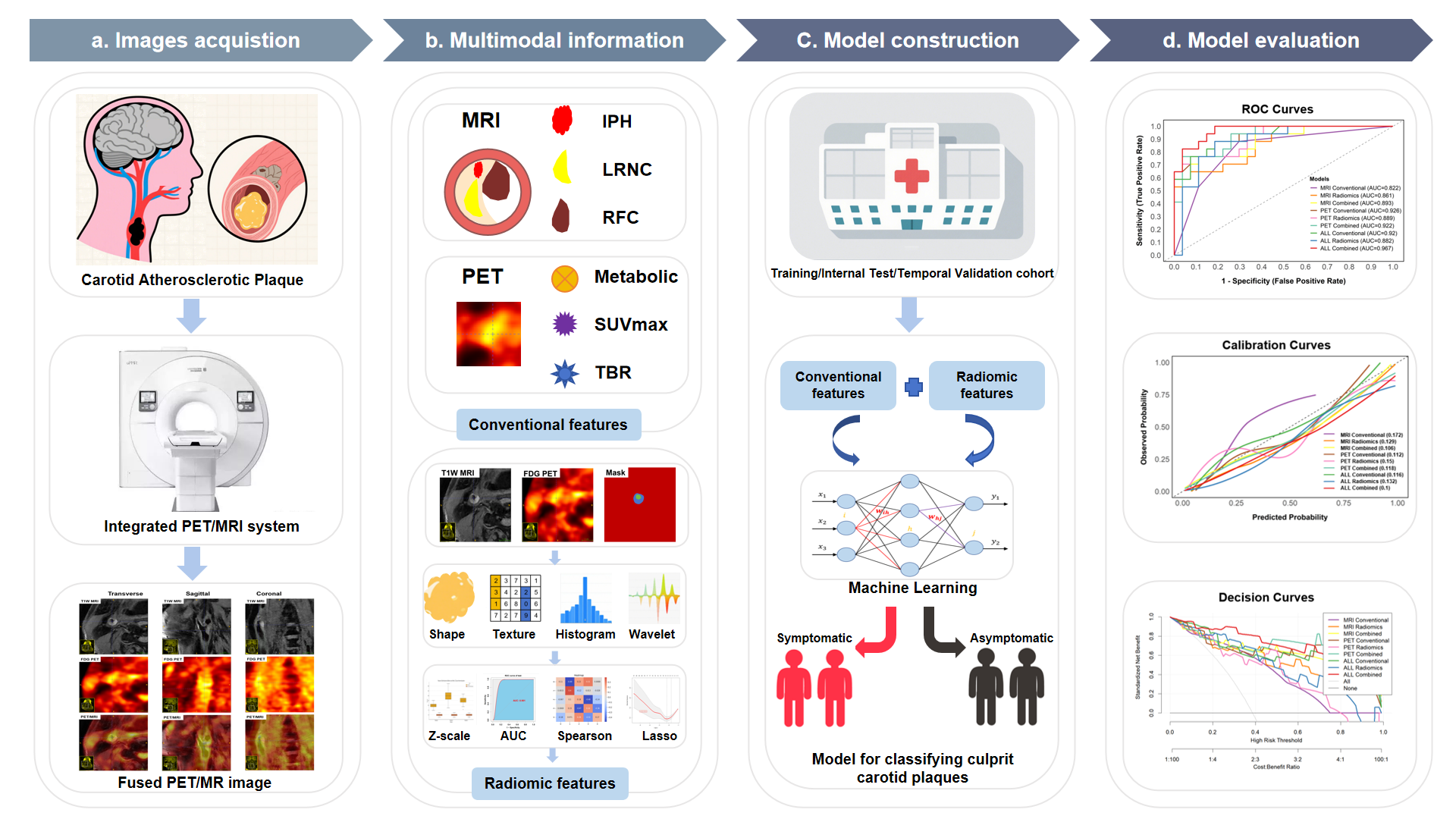 近期,中国科研实验室深圳先进技术研究院医学成像科学与技术系统全国重点实验室张娜研究员,联合上海交通大学医学院附属瑞金医院李彪教授团队,开发出一套面向临床的多模态融合颈动脉高风险斑块预测框架。该研究将氟-18-脱氧葡萄糖正电子发射断层扫描([18F]FDG PET)与MR-VWI相结合,构建了整合常规与放射组学特征的联合模型,显著提升了对症状性颈动脉斑块的无创识别精度。研究成果以"Integration of conventional and radiomic features from [18F]FDG PET/MR imaging for multimodal prediction of symptomatic carotid atherosclerotic plaques"为题发表于美国心脏协会权威期刊Journal of the American Heart Association